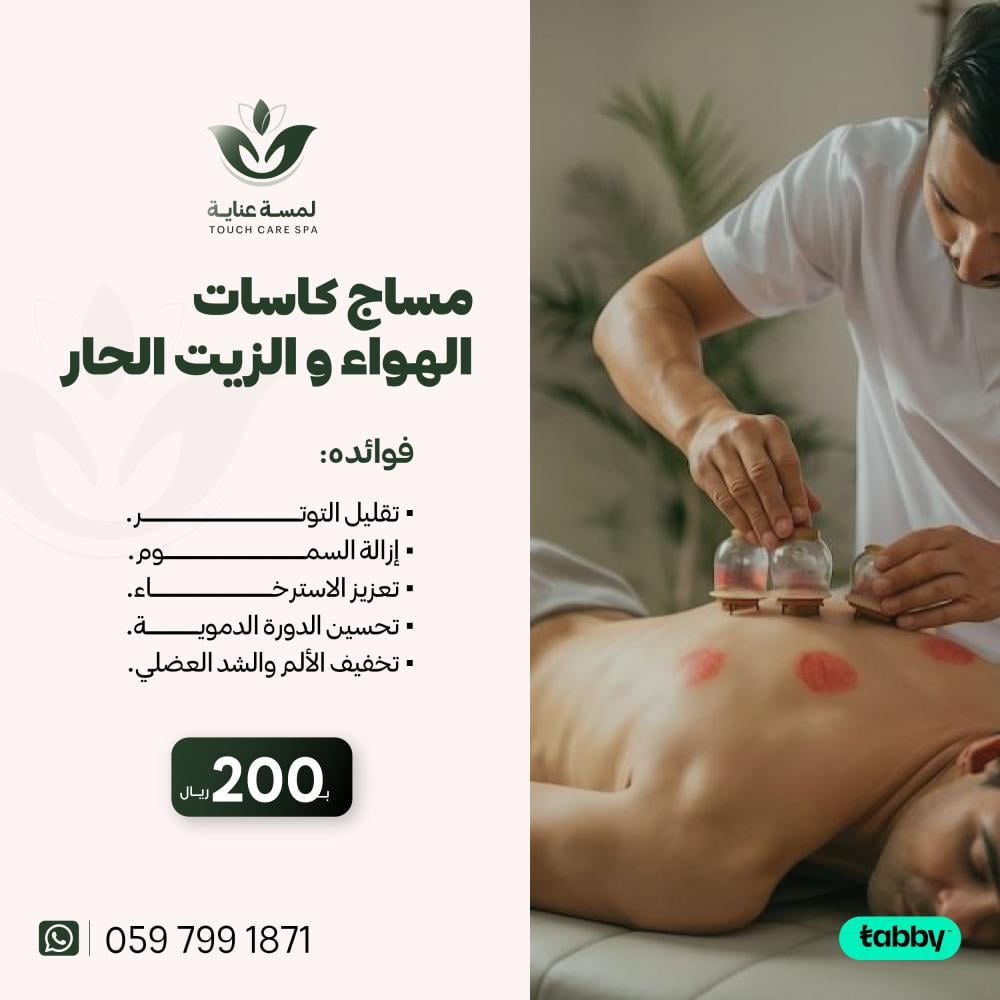 يا أهل جدة اللي تدورون على راحة مو عادية! دللوا أنفسكم بجلسة فريدة من مساج كاسات الهواء والزيت الحار لمدة 60 دقيقة في "مساج لمسة عناية". هذي الخدمة مصممة خصيصاً عشان تفك عنك التوتر، تحسن الدورة الدموية، وتجدد نشاطك باستخدام تقنيات طبيعية فعالة تجمع بين سحر كاسات الهواء ودفء الزيوت الحارة.